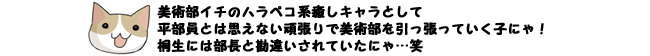 美術部所属。 展覧会に出展する為に自宅に籠って作品製作する為、 偶に忙しくて登校出来なかったりするらしい。 |