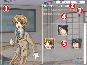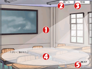 ゲームウィンドウにはキャラクターが表示され、 調べるコマンド選択時にはテキストウィンドウが 閉じられクリッカブルウィンドウとなります。 調べる・情報コマンドは、一度クリックするとコマンド画面が開き、 もう一度クリックすると画面が閉じゲームウィンドウに戻ります。